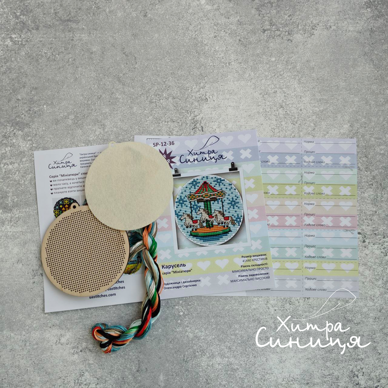 У складі набору: дерев’яна заготовка, перфорована під вишивку, фетрова висічка для задника, нитки DMC на органайзері, схема, інструкція, голка.