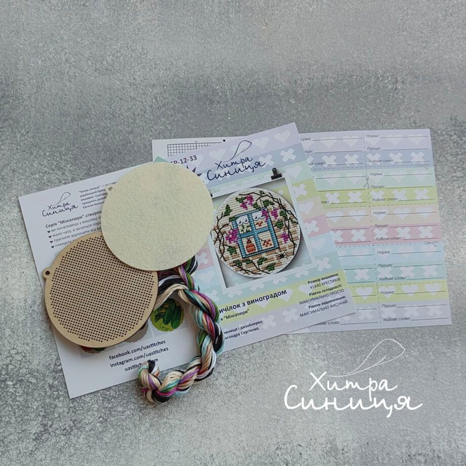 У складі набору: дерев’яна заготовка, перфорована під вишивку, фетрова висічка для задника, нитки DMC на органайзері, схема, інструкція, голка.