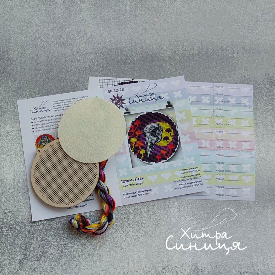 У складі набору: дерев’яна заготовка, перфорована під вишивку, фетрова висічка для задника, нитки DMC на органайзері, схема, інструкція, голка.